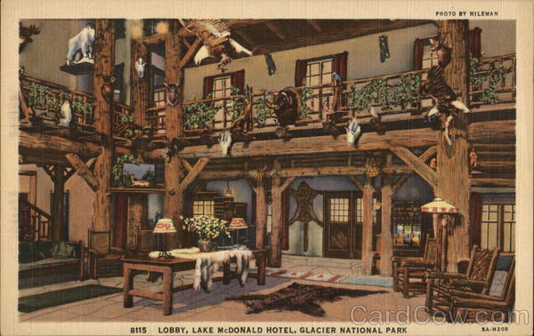 Front: PHOTO BY HILEMAN 8115 LOBBY, LAKE MCDONALD HOTEL, GLACIER NATIONAL PARK 5A-H208 Back: GLACIER PARK HOTEL CO. "C.T.ART-COLORTONE REG. U.S. PAT. OFF.