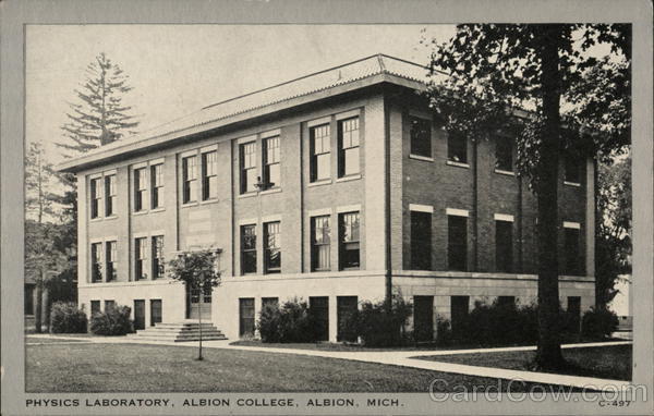 Front: PHYSICS LABORATORY, ALBION COLLEGE, ALBION, MICH. C-497 Back: CLEAR VIEW MANUFACTURED BY WAYNE PAPER BOX & PRTG. CORP., FORT WAYNE, IND.