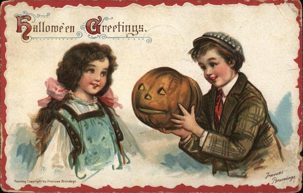 Front: Halloween alloween Greetings Painting Copyright by Frances Brundage. TA Frances Brundage Back: Postcard-Series No. 121. Revis OCT 25 For Correspondence. Manma your MAN 7912 Mis May anet Batton спе 1426. Santis st Liz Angle eal