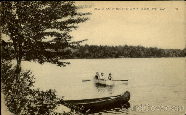 Front: VIEW OF SANDY POND FROM WEST SHORE,. AYER, MASS. 337 Back: 58 BOSTON, Mass. -PHOTO GELATINE Tas SPACE FOR MESSAGE Tas SPACE FOR ADDRESS
