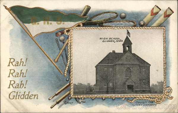 Front: Rah! Rah! Rab! Glidden (2007 HIGH SCHOOL, GLIDDEN, IOWA. padrejsen 18 Copyright 1908 by Fred C Lounsbury Back: 10007 84 FOR THE ADDRESS cyve You