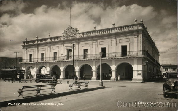 Front: עו Ginnisoildovadio E-E.BARROS-FOT. 17 PALACIO MUNICIPAL -MONTERREY N.L. Back: PROPIEDAD ASEGURADA DE C. ESPINO BARROW LOS PANORAMAS DE MEXICO, CARTOLINA POSTALE · TARJETA POSTAL