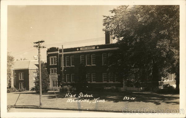 Front: HICH SCHOOL IE E HieH ScHoOOL MANNING, JOWA 593-1V Back: PORENE C NI JUN 21 CORRESPONS6PM S 7159 Mrs L L Moore 615 second st Manning John Lee Garroll 4960 Chamber Beaumont - Dex.