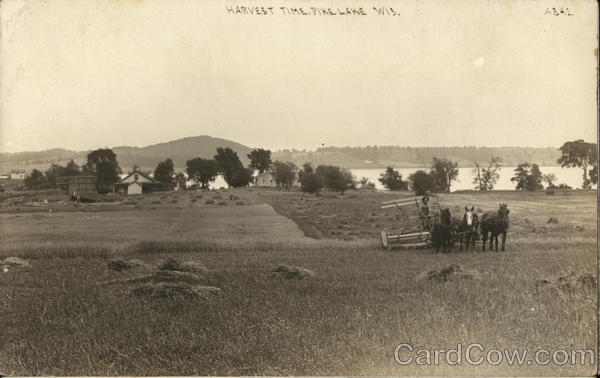 Front: HARVEST TIME. PIKE LAKE WIS. A&92. Back: Az O A = STAMP3 ΑΑ 2 ο Α A REAL PHOTO BY H. MONTGOMERY HARTFORD WIS., U S. A.
