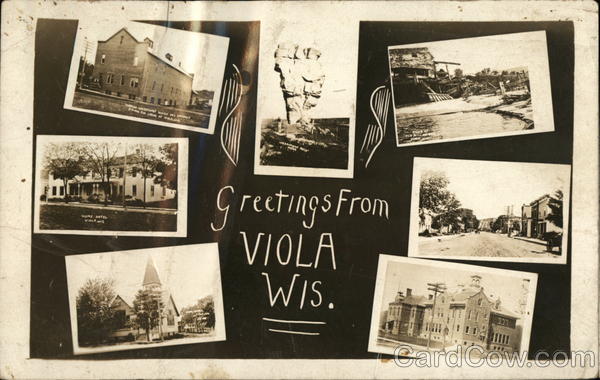 Front: TOBAL RAENE WHICH PAY AALLY A00 FoR LABOR AT VIAWIA OLD MILC yiaL w MONUMENT AOCA NEAR Greetings From VIOLA WIs. "HOME HOTEL VIOLA, WIS נננ Back: 271 POST CA AA 20 2 STAMP o HERE