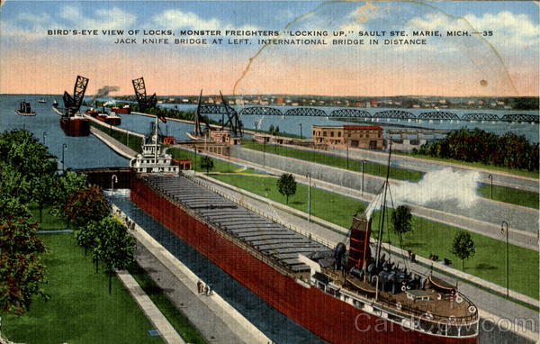 Front: BIRD'S-EYE VIEW OF LOCKS, MONSTER FREIGHTERS "LOCKING UP," SAULT STE. MARIE, MICH.-35 JACK KNIFE BRIDGE AT LEFT, INTERNATIONAL BRIDGE IN DISTANCE Back: (с CO 15091N PUB. BY A. E. YOUNG, SAULT STE. MARIE, MICH. MADE IN U. S. A.