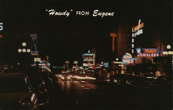 Front: FIRST BANK "Howdy" FROM Eugene #HEILIGE LU Huff's JEWELERS XX Back: K-1657 WILLAMETTE STREET Eugene, Oregon Color by Morton Luman Pub. by Smith-Western, Inc., 1425 S.W. 13th Ave., Portland 1, Oregon S-22626-1 HERE