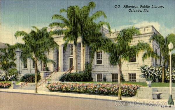 Front: O-3 Albertson Public Library, Orlando, Fla. 8A-H1426 Back: 2.50 "C.T.ART-COLORTONE" REG.U.S. PAT. OFF. MADE ONLY BY CURT TEICH & CO., INC., CHICAGO ORANGE NEWS CO., ORLANDO, FLA.