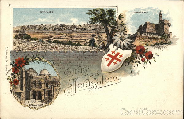 Front: L.Schoenecke Jerusalem JERUSALEM con 300 GRABESKIRCHE ORUC Ghass aus Jeragalem DAVIDSBURG. Back: Nur für die Adresse. POSTKARTE. Weltpost-Verein. Palaestina.