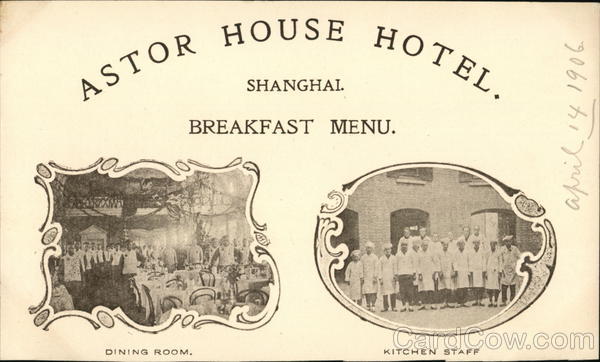 Front: ASTOR HOUSE HOTEL. SHANGHAI. BREAKFAST MENU. DINING ROOM. Thes KITCHEN STAFF april 14 1906. Back: UNION POSTALE UNIVERSELLE