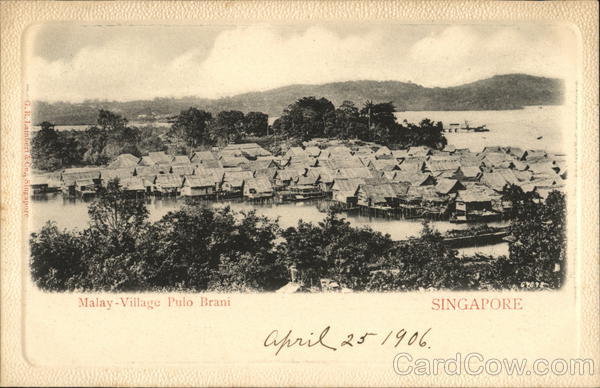 Front: G. R. Lambert & Co., Singapore: Malay-Village Pulo Brani April 25 1906. 112 SINGAPORE Back: STRAITS SETTLEMENTS THE ADDRESS ONLY TO BE WRITTEN ON THIS SIDE.