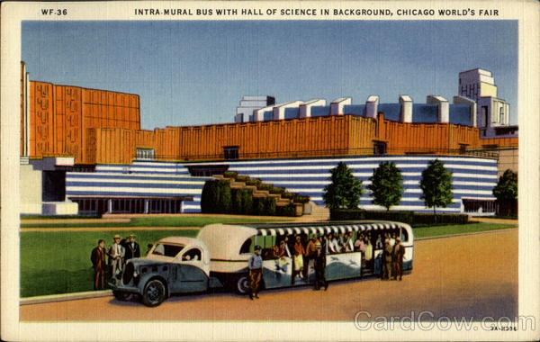 INTRA-MURAL BUS WITH HALL OF SCIENCE IN BACKGROUND, CHICAGO WORLD'S FAIR