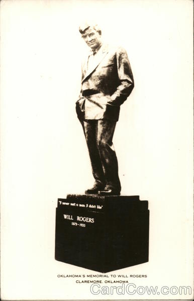 Front: 9 never met a man 9 didn't like WILL ROGERS 1879-1935 OKLAHOMA'S MEMORIAL TO WILL ROGERS CLAREMORE. OKLAHOMA Back: یایی 30 EK HERE