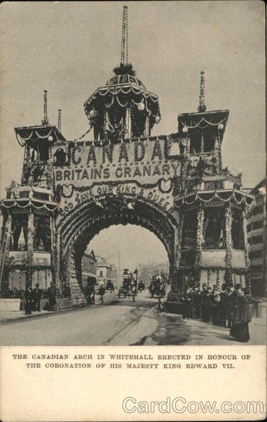 Front: OCANADALI BRITAIN'S CRANARYA SAVE OUR KING QUEEN AV THE CANADIAN ARCH IN WHITEHALL ERECTED IN HONOUR OF THE CORONATION OF HIS MAJESTY KING EDWARD VII. Back: Raphael Tuck & Sons' "Empire" Postcard. Series 667 Phototyped in Haarlem. No SU ERICS