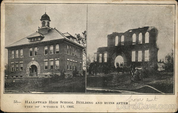 Front: 推優惠 ACE from aut Nellie 53- HALLSTEAD HIGH SCHOOL BUILDING AND RUINS AFTER FIRE OF . OCTOBER 13, 1906. 6. Back: NOTHING BUT ADDRESS ON THIS SIDE. PUT A POSTAL HERE.