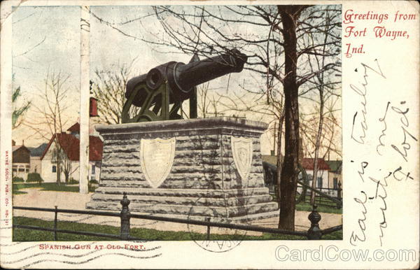 Front: WAYNE SOUV. PUB. CO. NO. 31 SPANISH GUN AT OLD-FORT. Greetings from Fort Wayne, Ind. herzung Earl Floyd. نامه Back: 25 7PM APR Pos 22-PM 1901 Mrs. R. A. Broun afford M.y. Of XO IN 1790 106 FRAN UNITED STATES OF 2061 SADIAN میں کی