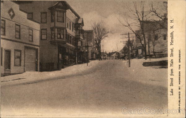 Front: 17 Lake Street from Main Street, Meredith, N. H. 3959-PUBLISHED BY MORRISON THE DRUGGIST. Back: AYER, MASS. E, PAPER & STATIONERY CO. MFRS. #450 рт HERE