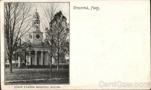 Front: FIRST PARISH MEETING HOUSE. Concord, Mass. Back: Do Private Mailing Card. ox AUTHORIZED BY ACT OF CONGRESS-MAY 19. 1898. OD (POSTAL CARD - CARTE CARTE POSTALE.)= POSTALE.) 100 PLACE THE HERE