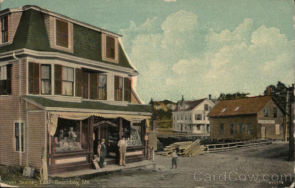 Front: Street Scenie, East Boothbay, Me ROVISIONS GROCERIES 70001 *** TE NU IF FISH & MEAT MARKET 214179 Back: 150 The Leighton & Valentine Co., N.Y. City 214179 THROUGHOUT TRADE MARK. QUALITY FAMOUS THE WORLD CARD