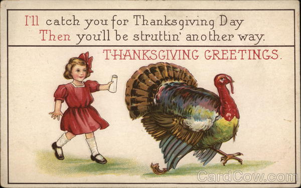 Front: I'll catch you for Thanksgiving Day Then you'll be struttin' another way. THANKSGIVING GREETINGS. 20 Back: Series 54 E FOR ADDRESS ONLY