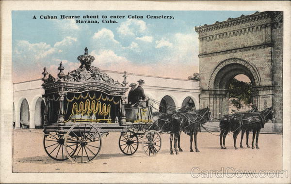 Front: A Cuban Hearse about to enter Colon Cemetery, Havana, Cuba. ADXUD ny www. TOTTEN TING SE Back: 17 56 "Swan, Havana. A CUBAN HEARSE about to enter Colon Cemetery in Havana. 21746N Co