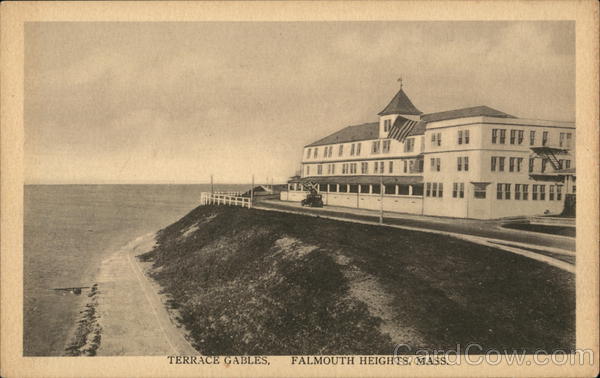 Front: TERRACE GABLES, FALMOUTH HEIGHTS, MASS. HI YU Back: Pub. by Fred S. Howard, Falmouth, Heights, Mass TAUNTO ENESTERN LWAYS SOME THING MASS MAN & SON HADICKER CARD