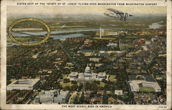 The most scenic ride in America Washington Airport, Inc. South end of the Highway Bridge. Washington DC. The thrill of a ride over the National Capital may now be enjoyed in the New Ryan Broughams "Sister Ships of the famous Spirit of St. Louis" and exact duplicates of Lindbergh's new ship. Reached by Alexandria Street Cars from 12th and Pa. Ave. or Alexandria Buses. Fare five cents. Safety 1928 / over nine times around the earth / United States Air Transport C. T. American Art Colored |