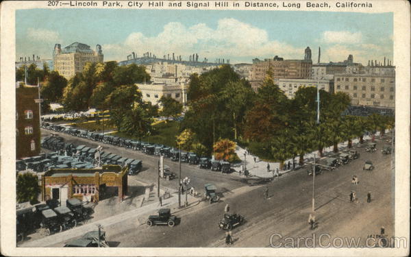 Front: ATA 207:-Lincoln Park, City Hall and Signal Hill in Distance, Long Beach, California 5.0 Juig Juca jane パーク PARKING in DIE 1.1 14256 Back: Pab. by the M. Kashower Co., Los Angeles, Cal. HADENUSA IN STAMP HERE