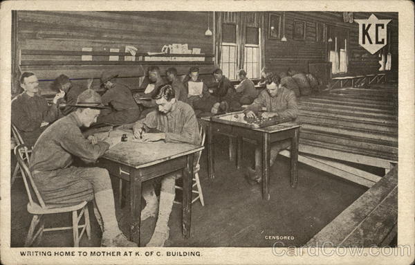 Front: H A WRITING HOME TO MOTHER AT K. OF C. BUILDING. CENSORED KC 30 ZVA Back: oat THIS SPACE FOR ADDRESS ONLY