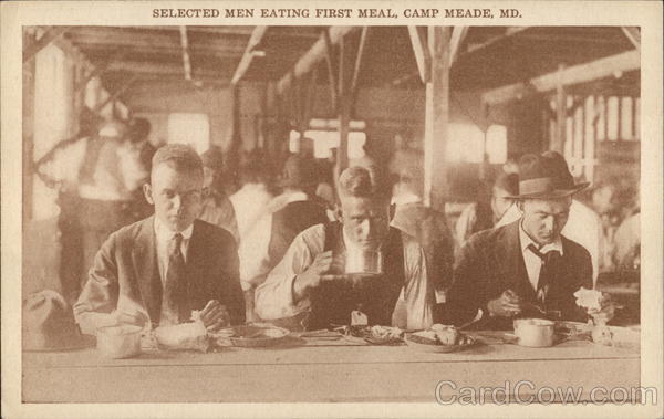 Front: SELECTED MEN EATING FIRST MEAL, CAMP MEADE, MD. Back: PUBLISHED BY THE CHESSLER Co., BALTIMORE, MD. Post Cardzel Here