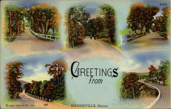 Front: S-516 JREETINGS 187 HARRISVILLE, Maine © CURT TEICH & CO.. INC. Back: C. T. GROUP SCENICS 10 SUBJECTS OB-H1474