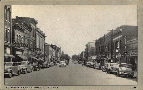 Front: S. MOAK RESTAURANT H. E. BARDWARE S. AUTO Katy] SUPPLIES CAFE NATIONAL AVENUE, BRAZIL, INDIANA H-448 Back: VIEW CLEAR MFD. BY WAYNE PAPER BOX & PRTG CORP., NORT WAYNE, IND Brazit chaud