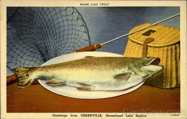 Front: MAINE LAKE TROUT Greetings from GREENVILLE, Moosehead Lake Region E-5944 Back: PONSOR Made 1789=972 of fish they cats, Machine Sennilson in Maine How about it? 11 alga are Worcester, Mass Hannah لرستار ceے