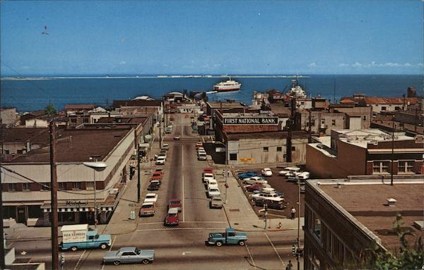 This bird's eye view shows part of the business district, waterfront and harbor of this bustling city which is the trade center and county seat of Clallam County. The Black Ball Ferry "COHO" is leaving for the trip to Victoria, BC. Dexter Press Inc. |