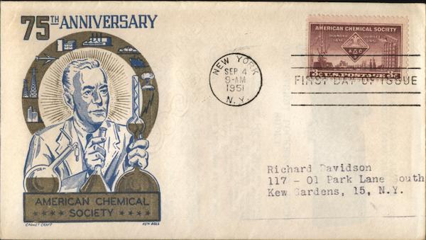 75TH ANNIVERSARY AMERICAN CHEMICAL *** SOCIETY *** CAGHET CRAFT KEN BOLL YOR SEP 4. 9-AM 1951 N. Y 1^^^^ AMERICAN CHEMICAL SOCIETY DIAMOND 1876 AAC JUBILEE 1951 AGE FIRST DAY OFISSUE Richard Davidson 117 - 01 Park Lane South Kew Gardens, 15, N.Y.