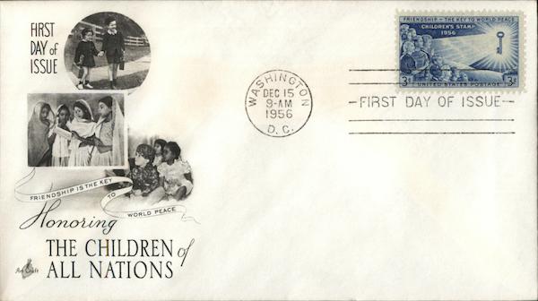 FIRST DAY of ISSUE FRIENDSHIP IS THE KEY Honoring THE CHILDREN of ALL NATIONS Art Craft TO WORLD PEACE SHING WA DEC 15 9-AM Z 1956 D. C. FRIENDSHIP THE KEY TO WORLD PEACE CHILDREN'S STAMP NA 1956 3¢ D1A4 3.¢ -FIRST DAY OF ISSUE-