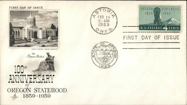 FIRST DAY OF ISSUE STATE CAPITOL SALEM, OREGON Pioneer Mother th 100% ANNIVERSARY Art Craft OREGON STATEHOOD 1859-1959 STORIA FEB 14 9-AM 1959 RE STAT ht OREG ....... GON OREGON 1859 STATEHOOD 1959 FIRST DAY OF ISSUE
