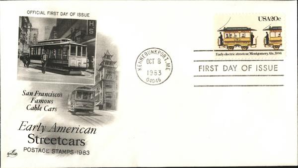 ArtCraft OFFICIAL FIRST DAY OF ISSUE AMAS ON San Francisco's Famous Cable Cars SH Early American Streetcars PORT ME OCT 8 KENNEBUNK 1983 04046 USA20c AMNE Early electric streetcar, Montgomery, Ala.., 1886 FIRST DAY OF ISSUE