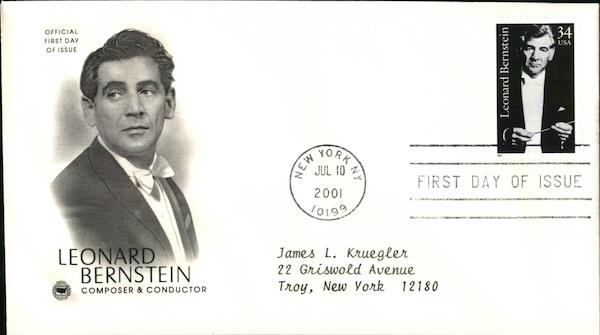 OFFICIAL FIRST DAY OF ISSUE LEONARD BERNSTEIN COMPOSER & CONDUCTOR YORK JUL 10 Z 2001 10199 Leonard Bernstein James L. Kruegler 22 Griswold Avenue Troy, New York 12180 34 FIRST DAY OF ISSUE