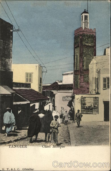 Front: TANGIER 11 V. & J. C. Gibraltar DALEN LLOLL BAZAR ESPANOW Chief Mosque RENAMA ORA APPLY FRE Back: Moroc. Carte postale