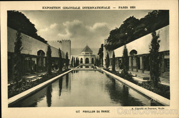 Front: 201 EXPOSITION COLONIALE INTERNATIONALE 11 111 00111 437 PAVILLON DU MAROC PARIS 1931 A. Laprade et Fournez, Archs. Back: 50 جي BRAUN & Cie, Imp., ELITEURS-CONCESSIO.NNAIRES PARIS FRANCE Sh CARTE POSTALE