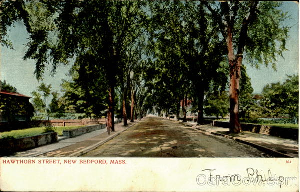 Front: HAWTHORN STREET, NEW BEDFORD, MASS. From Philip. 541 Back: Made in Germany. A.C.Bosselman & Co., New York. 1.00 OCT 1906 MASS Miss Irene Douglass Acushnet Mass. ace Postage- Domestic: Two Cente