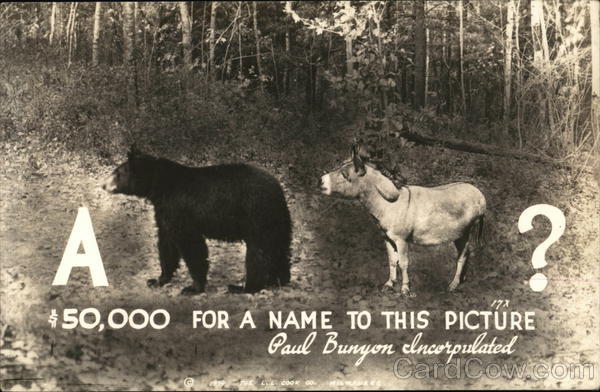 Front: 17X $50,000 FOR A NAME TO THIS PICTURE Paul Bunyon elncorpulated 1939 THE L.L. COOK CO. MILWAUKEE ? Back: Ek معافی