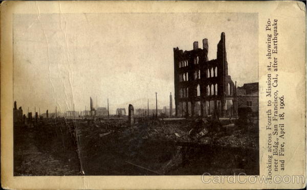 Front: Looking across Fourth to Mission st., showing Pio- neer Bldg., San Francisco, Cal., after Earthquake and Fire, April 18, 1906. Back: SOUVENIR POSTCARDS S SIDE IS EXCLUSIVELY FOR THE ADDRESS M. RIEDER, PUB., LOS ANGELES, CAL. TWO CENTS