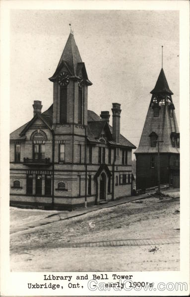 Front: GRUZ 1887 INSTITUTE PUBLIC LIBRARY Library and Bell Tower Uxbridge, Ont, early 1900's Back: BEST WISHES IN CENTENNIAL YEAR FROM DAVIE PHARMACY MADE IN CANADA 1,00 HERE