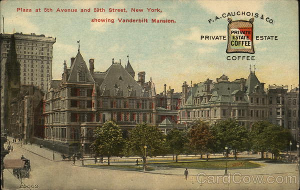 Front: Plaza at 5th Avenue and 59th Street, New York, showing Vanderbilt Mansion. PRE 25869 food lii 11 F.A.CAUCHOIS & CO. PRIVATE PRIVATE ESTATE ESTATE COFFEE Man COFFEE. BO Back: Henry Miss Hazel Van allen, STAMP HERE