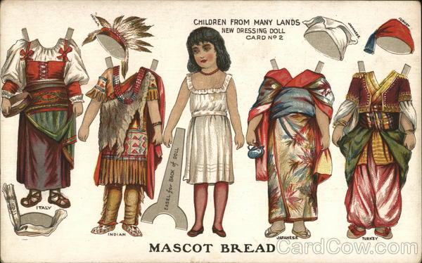 Front: MS ITALY INDIAN. INDIAN DOLL of EASEL for BACK CHILDREN FROM MANY LANDS NEW DRESSING DOLL CARD NO 2 MASCOT BREAD JAPANESE JAPANESE TURKEY TURKEY Back: TRY BUY .. USE Mascot Bread Ca CONDON BAKERY RSX 500 …...... ....