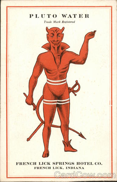 Front: PLUTO WATER Trade Mark Registered FRENCH LICK SPRINGS HOTEL CO. FRENCH LICK, INDIANA Back: MADE BY PLUTO PAESS, FRENCH LICK, INDIANA, U. S. A. HERE