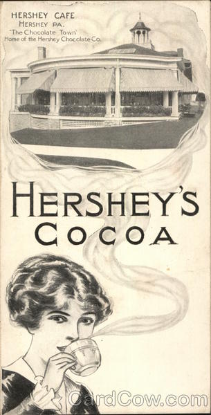 Front: HERSHEY CAFE HERSHEY PA. "The Chocolate Town Home of the Hershey Chocolate Co. HERSHEY'S СОСОА Back: WRITE MESSAGE BELOW TWO CENTS