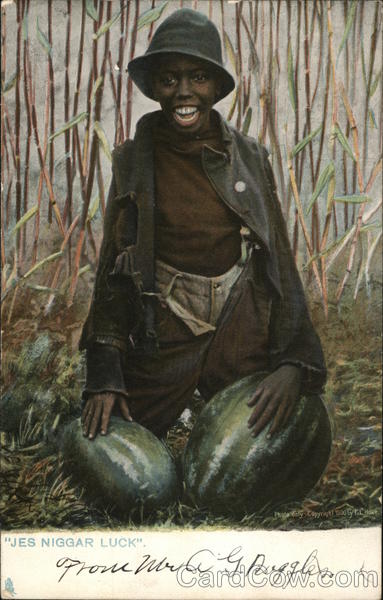 Front: Che "JES NIGGAR LUCK". Photo only Copyright 1900 by F.L.How From Mr AG. Roggles. Back: Raphael Tuck & Sons' Post Card Series No 2363, "Happy Darkies." ART FUBLISHERS TO THEIR MAJESTIES THE KING AND QUEEN. ARTISTIC POST CARD.
